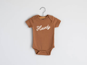 Say "Howdy" with charm! This ultra-soft, 100% organic cotton bodysuit showcases modern script in bright white ink on a cozy camel background. Lovingly designed and screen printed by hand in Ohio, it’s perfect for welcoming your little one to the world. Features include nickel-free snaps, water-based dyes, and eco-friendly, hypoallergenic materials—all sustainably and ethically made with GOTS certification.