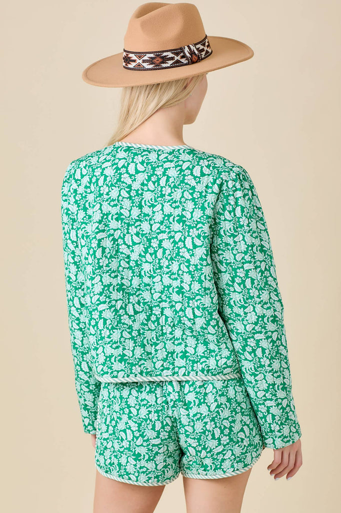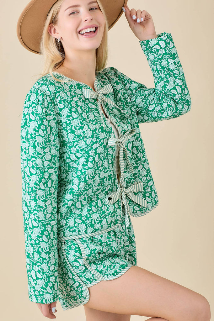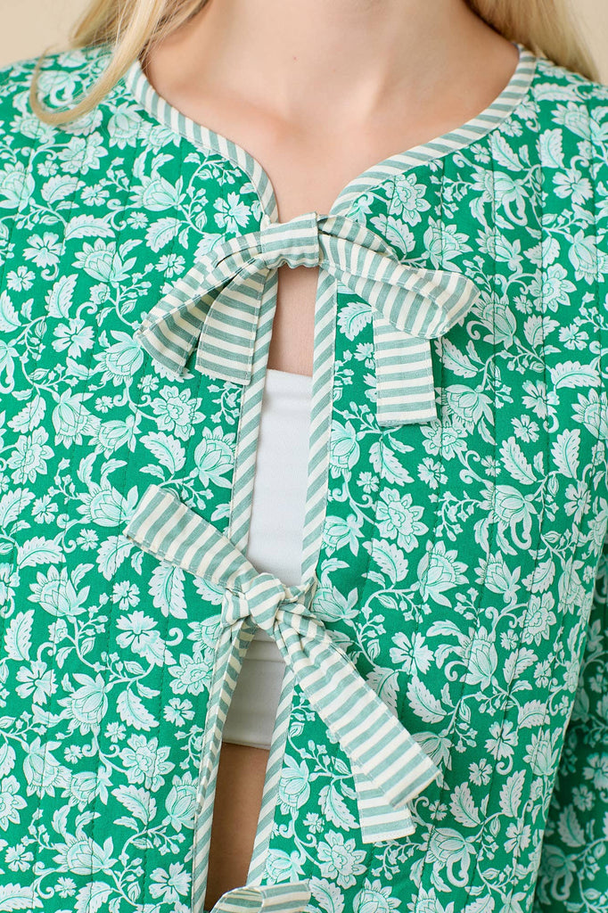 Upgrade your style with a touch of Southern charm! Our quilted round neck jacket features a unique ribbon tie opening for a playful twist on a classic design. Wear it open or closed, and even reverse it for a new look. (Just like your grandma, but cooler.)