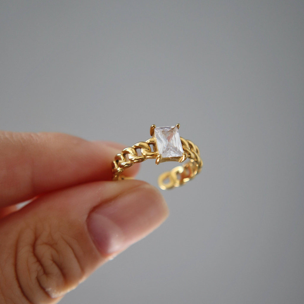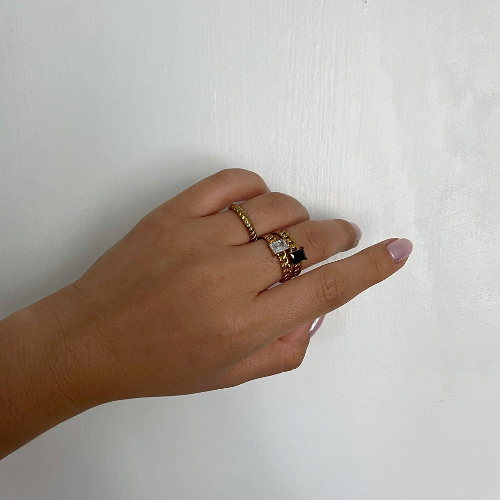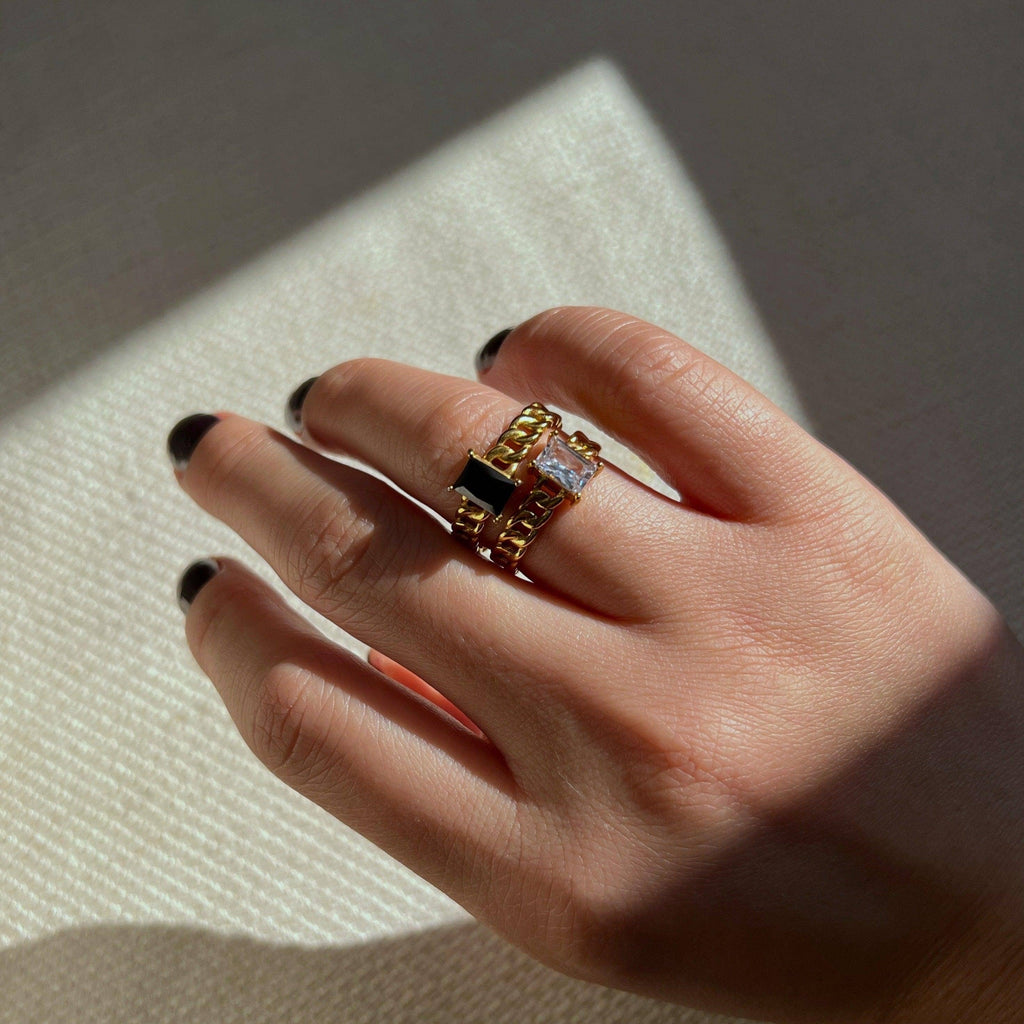 Ideal for stacking or striking on its own, the Julie Ring is available in both black and white. This ring features a beautiful gem sitting pretty on a classic chain band. The ring is fully adjustable so one size fits all!