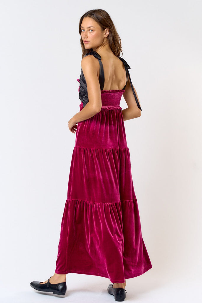 Twirl in style with our Tied In A Bow Velvet Dress. This maxi dress features a luxurious velvet material, layered tiers, and a smocked bust for a flattering fit. Plus, the adjustable shoulder bow ties add a playful touch. Perfect for any occasion!