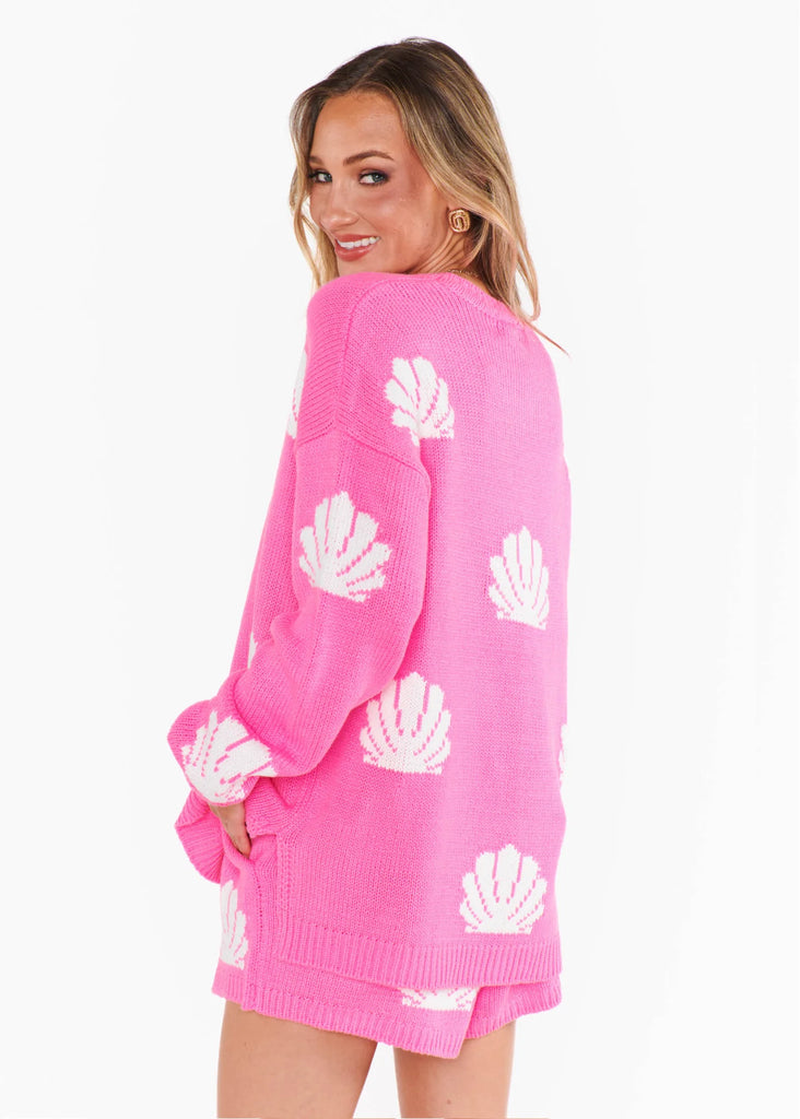 Get ready to Shell Out for this cute and playful Shell Pink Sweater. Perfect for resort wear or a day at the beach, it's also super comfy! Don't miss out on this quirky must-have piece!