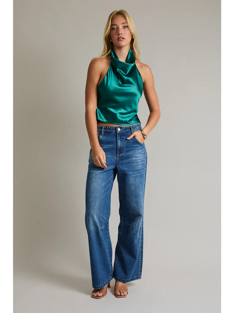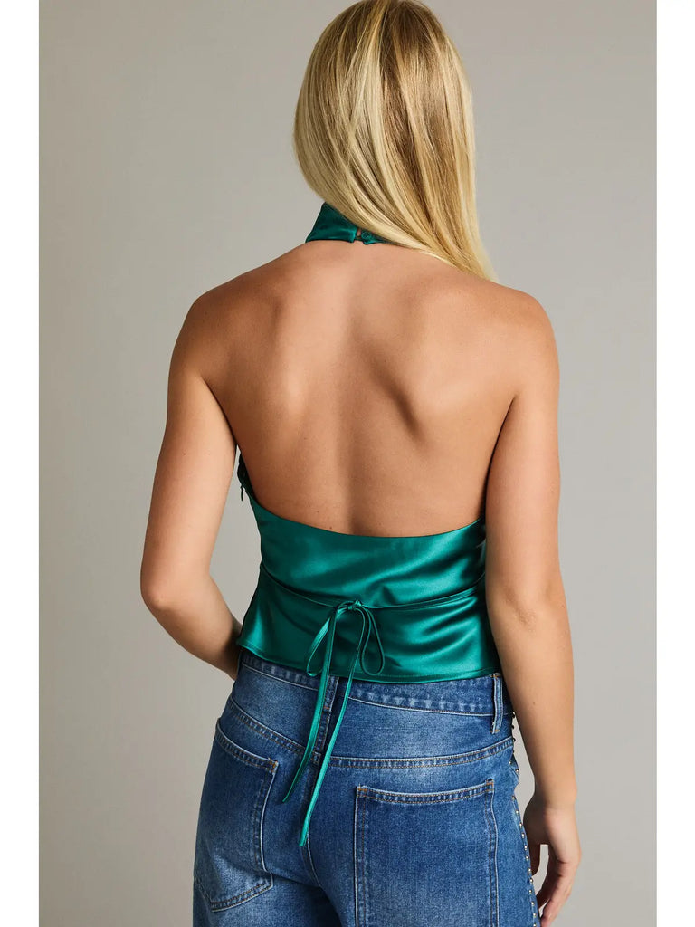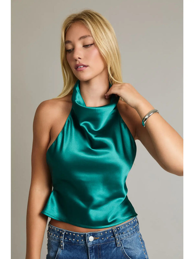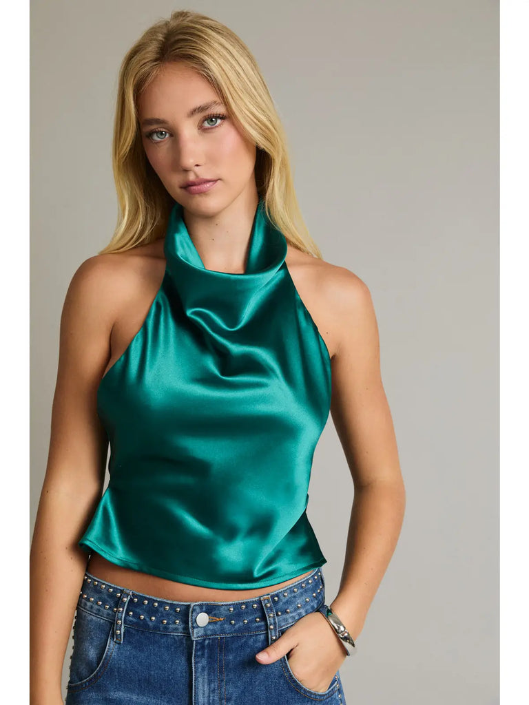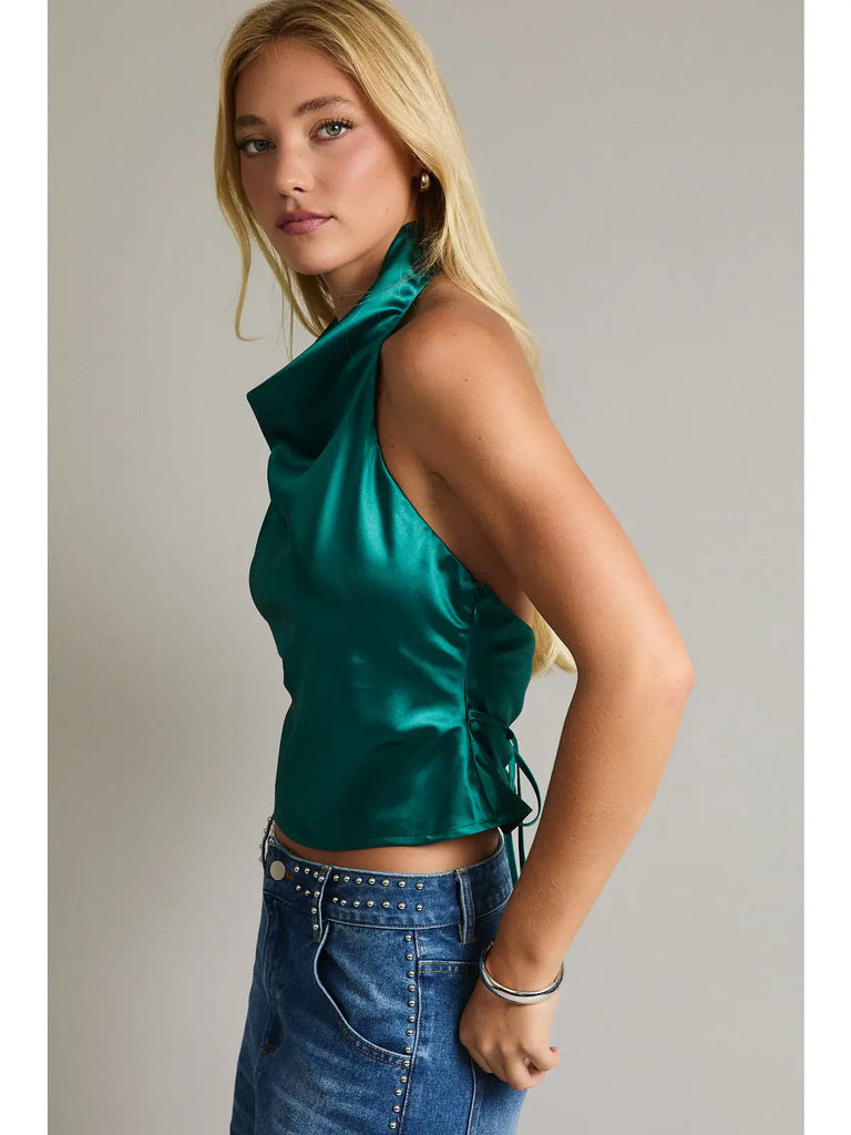 Make your grand entrance in this satin showstopper that screams Emerald City chic. The draped halter cowl neck is pure elegance, while the back strap cinches everything just right for a fit that feels custom-made. Silky, sophisticated, and ready to steal the spotlight—because blending in is overrated anyway.