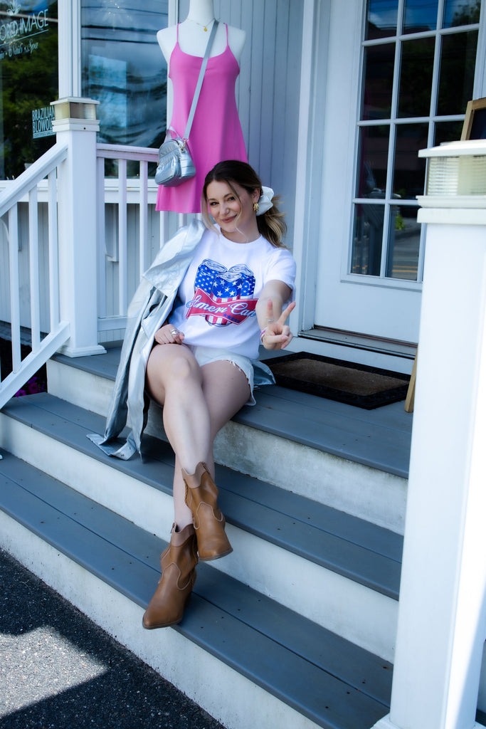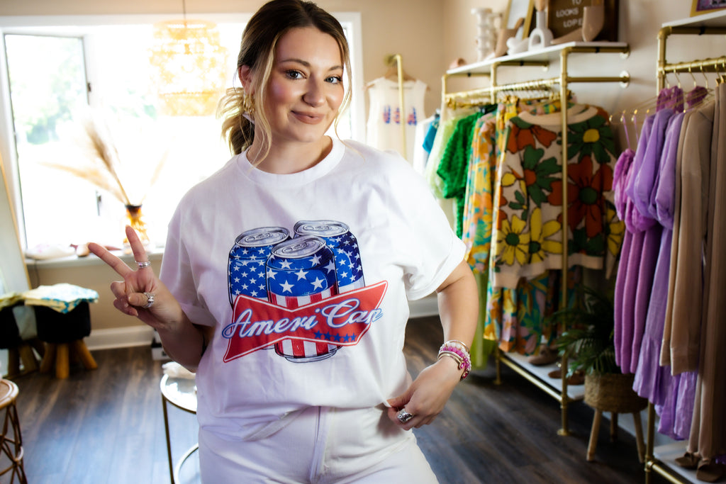 Our Ameri-Can Tee features an all-American design with a stylish patriotic flair that is sure to turn heads. Show your support for the red, white, and blue while looking your best in this fun and cute T-shirt.