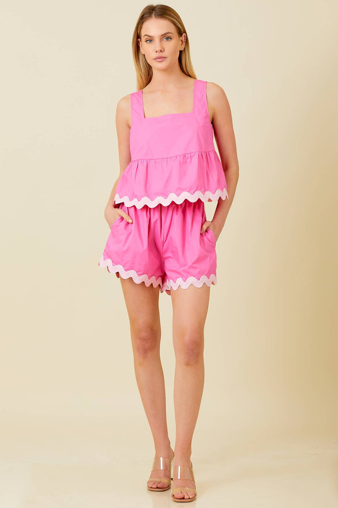Add some playful flair to your wardrobe with this square neck cotton top! The sleeveless design is perfect for a relaxing day, and the wavy trim adds a unique touch. Made with comfort in mind, this top is comfy enough for all-day wear. Pair it with matching shorts for an adorable set!