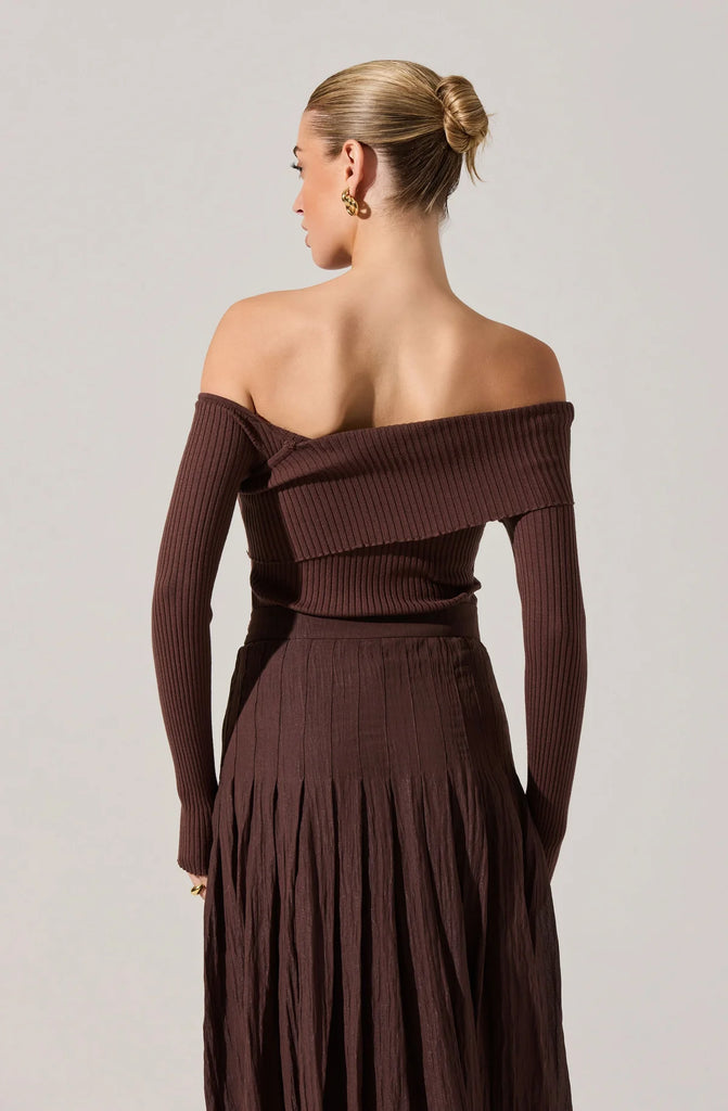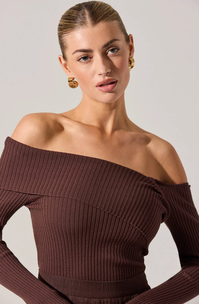 Embrace the season with the Daniella Sweater Top in a rich brown hue—your new fall essential. Its off-the-shoulder design adds a sexy, flirty touch perfect for date nights or romantic outings. Soft and feminine, this cozy sweater combines comfort with style, making it a playful staple for cooler days.