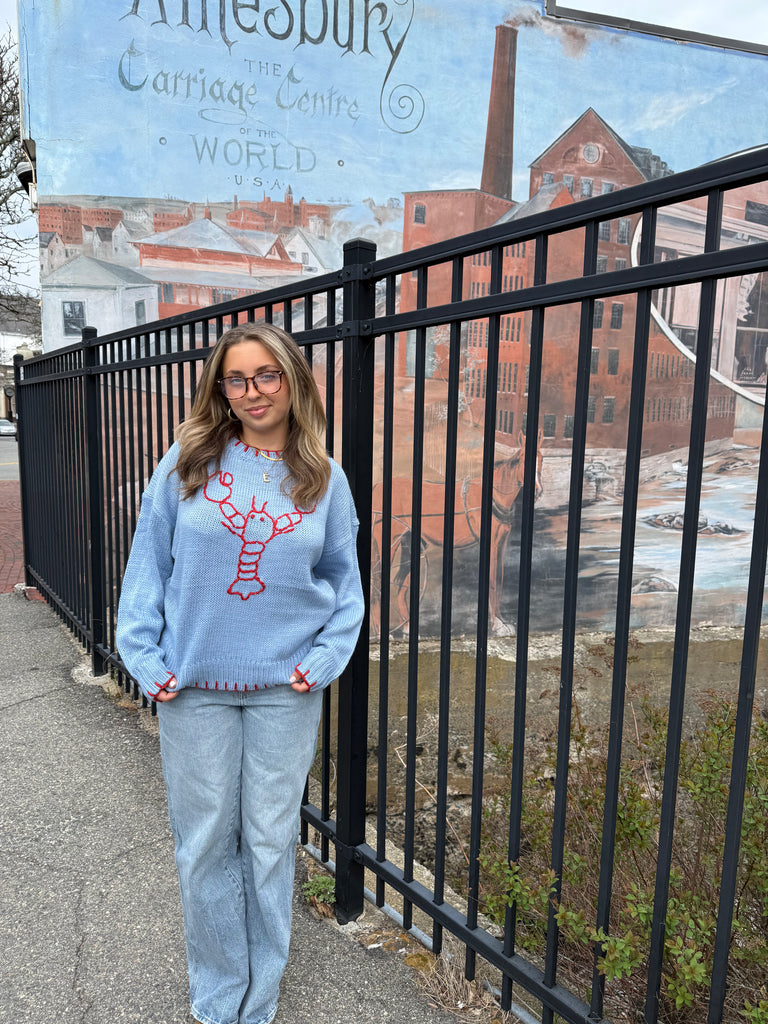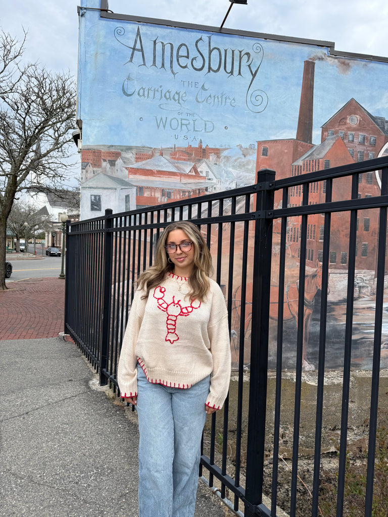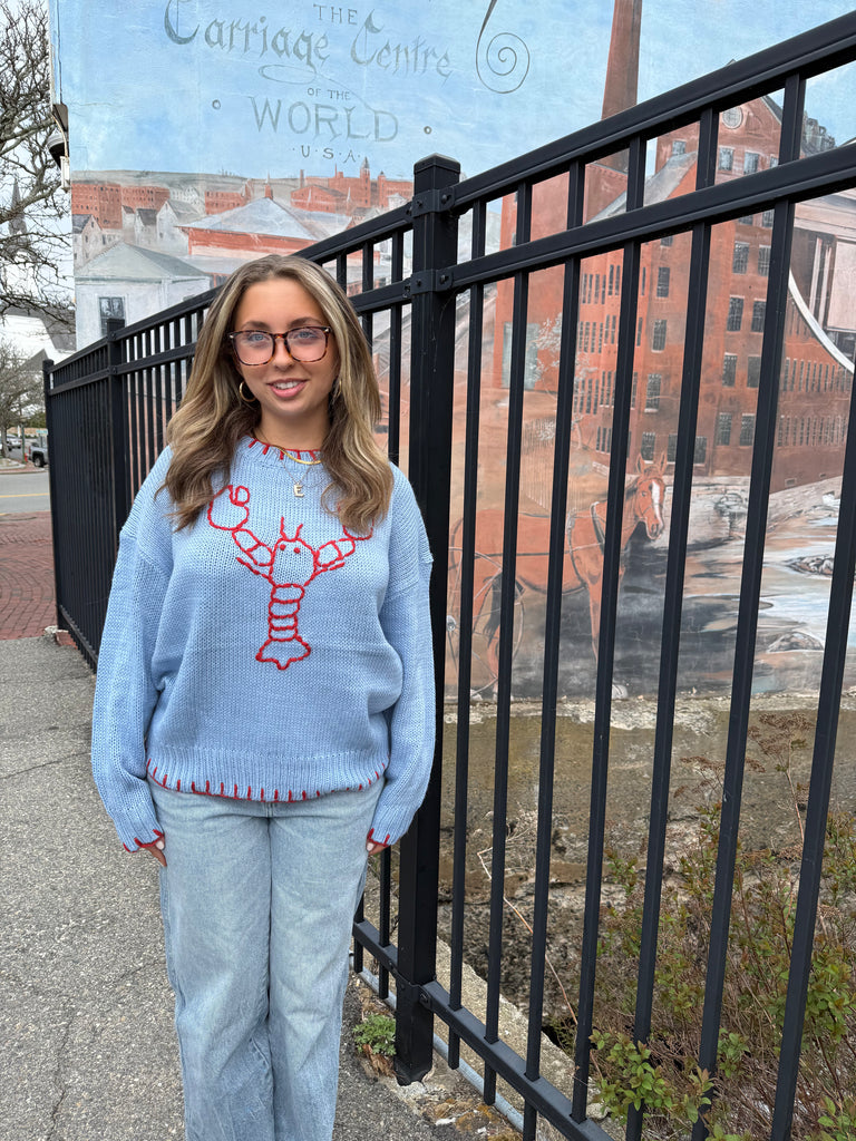 Get your claws on this adorable sweater! With a playful red lobster design, this cute beige or blue sweater is perfect for staying warm in the coastal breeze. A cozy and stylish with sweater - perfect for any fashion-savvy crustacean lover.