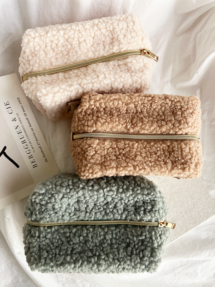 Teddy Bear Fabric Makeup Bag - a charming and cozy addition to your beauty routine. This makeup bag is designed with plush, teddy bear-like fabric that not only adds a touch of sweetness but also keeps your cosmetics and beauty essentials neatly organized.