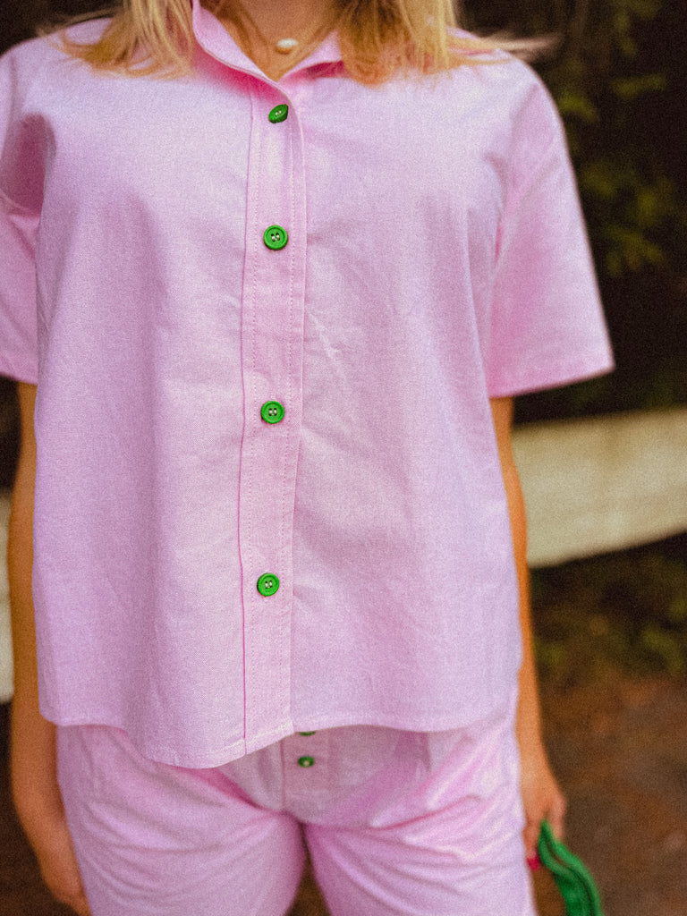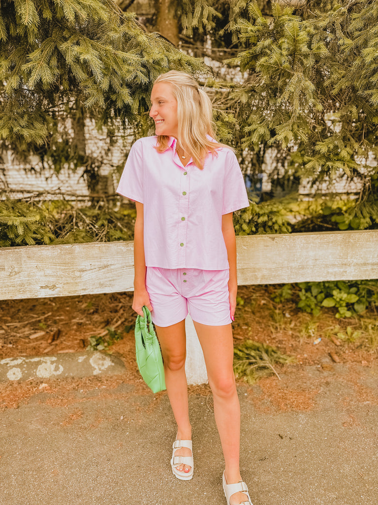 The Caught In The Cape Shorts are the perfect addition to your summer wardrobe. Crafted from lightweight cotton, these shorts come in a bubble gum pink color with green button detailing. Match them with the coordinating Caught In The Cape Shirt for a complete look that will easily take you through the warmest days.