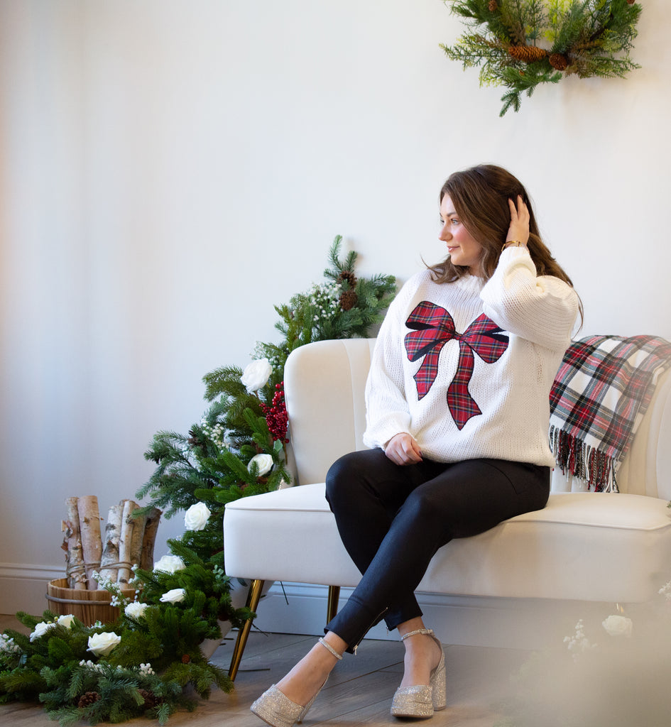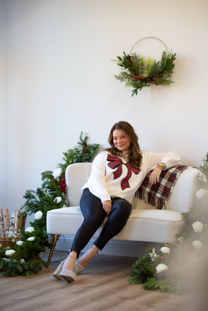 "Add a pop of festive charm to your holiday hosting outfit with our Don't Forget The Bow Sweater! Featuring a playful plaid bow and vintage Christmas vibes, this classic cream and green sweater is the perfect way to stay cozy and stylish all season long."