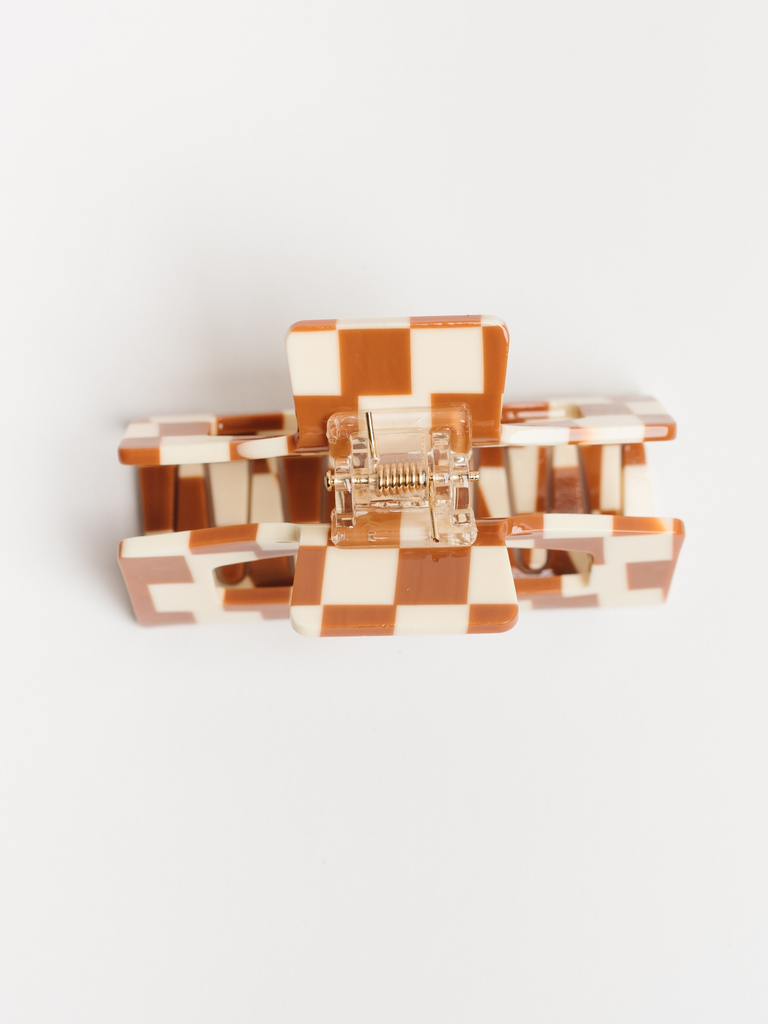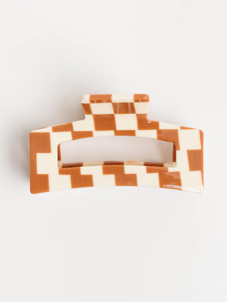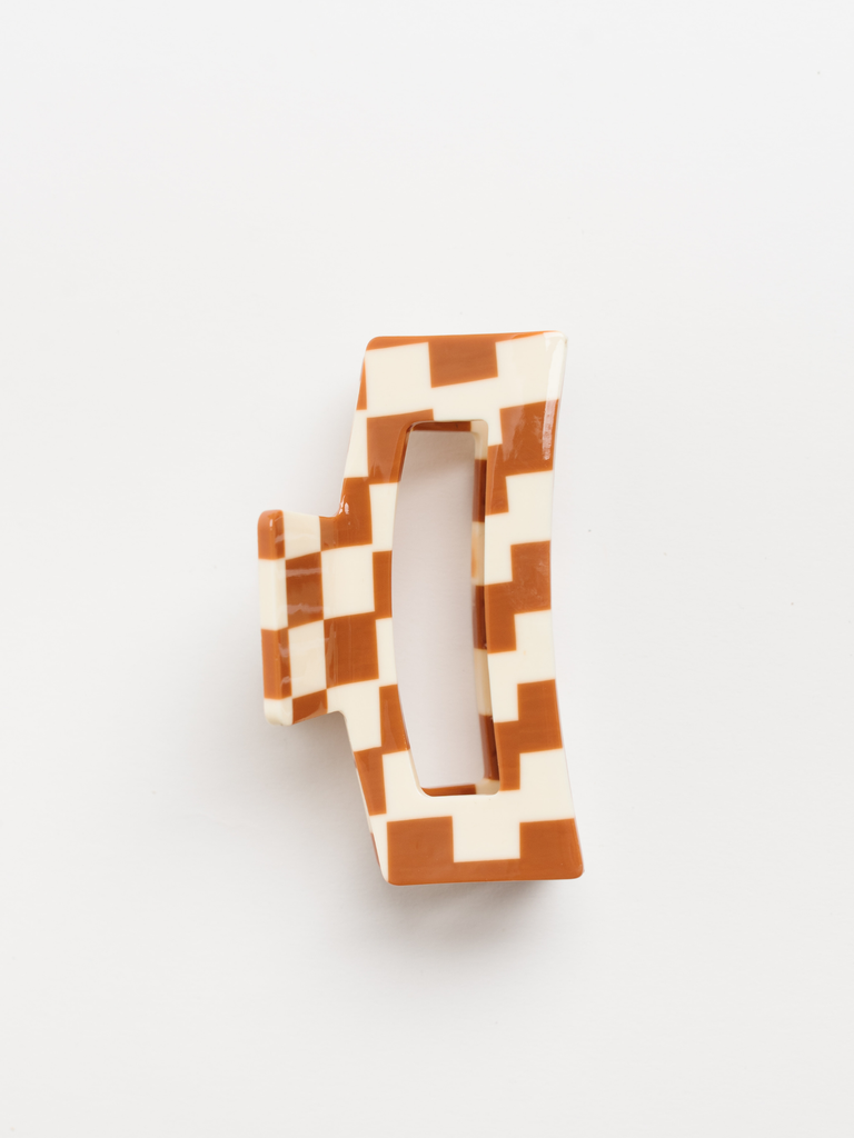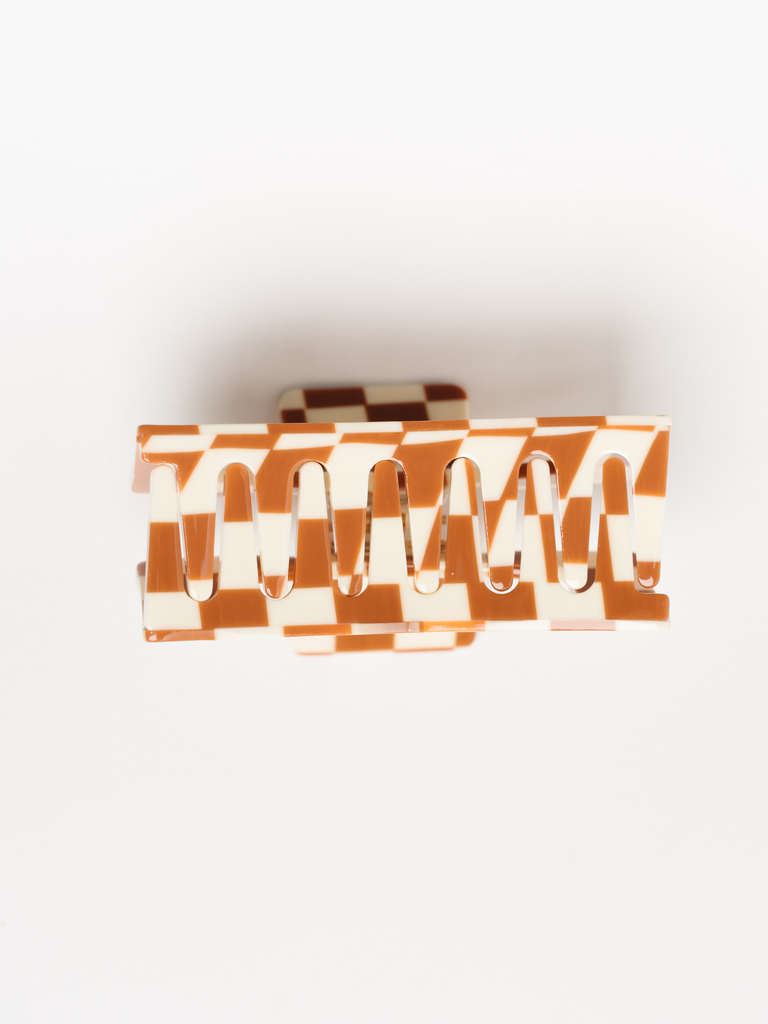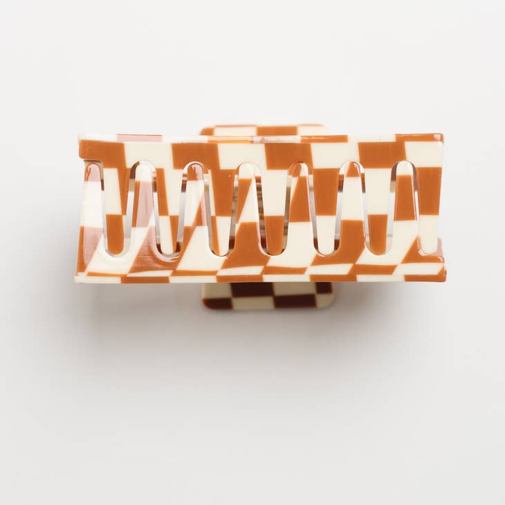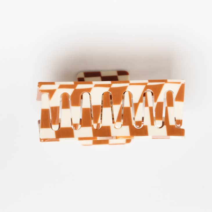 Have a little fun with your hair game with our Chin Up Checkered Claw Clip. Made from sustainable cellulose acetate, this purposely imperfect hair claw features a unique checkered pattern and reinforced spring coils for a strong hold. Perfect for adding a quirky touch to your hairstyle!