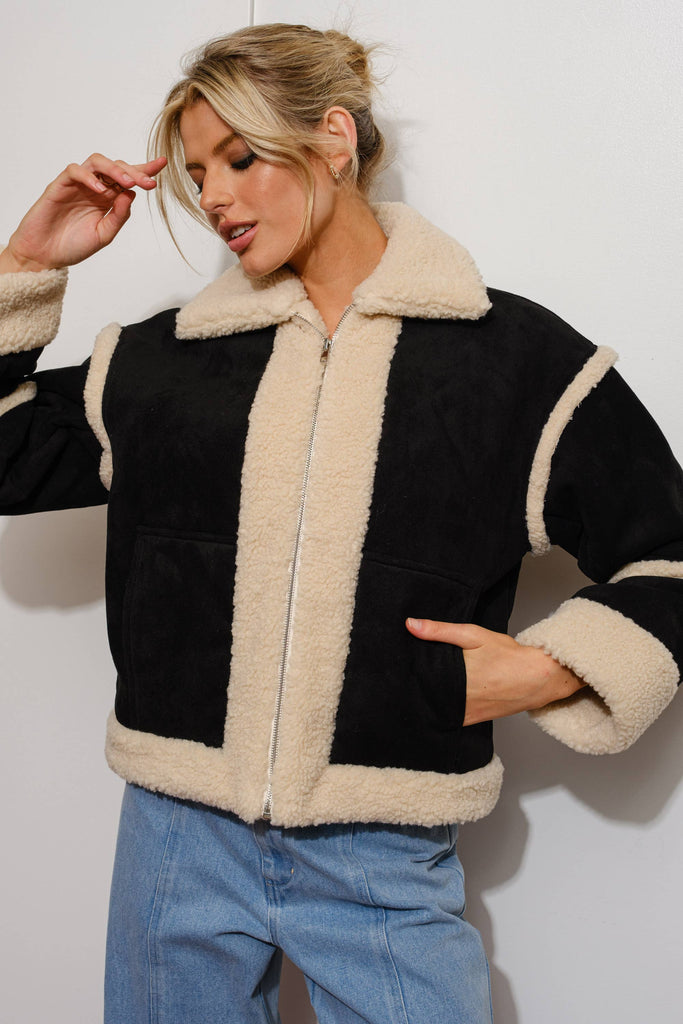 Wrap yourself in style and comfort with our Suede Shearling Jacket. This hip-length beauty features a faux suede and shearling fabric combo, perfect for chilly days. With a front zipper closure and two pockets, it's both practical and chic. Available in sizes S-L, with model shown wearing a size small.