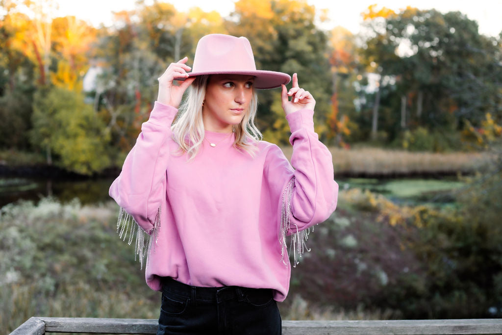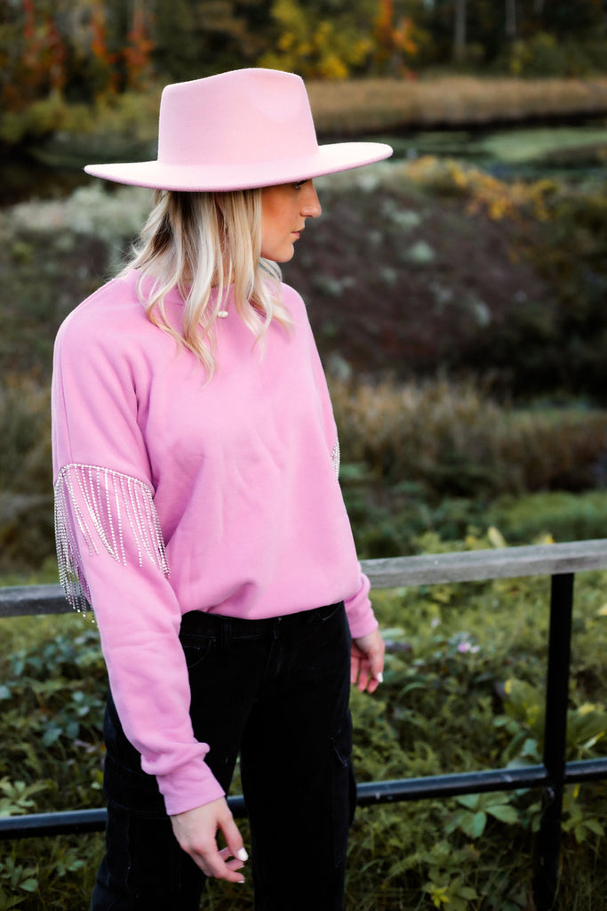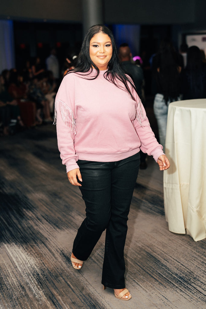 Let's Rock in the Rockin' Rhinestone Sweatshirt! It is the most comfy yet stylish sweatshirt of the season! Pair with our new Midnight Denim and watch your look TRANSFORM! This style is the definition of Boho Chic! The fringe rhinestone detail is unmatched!