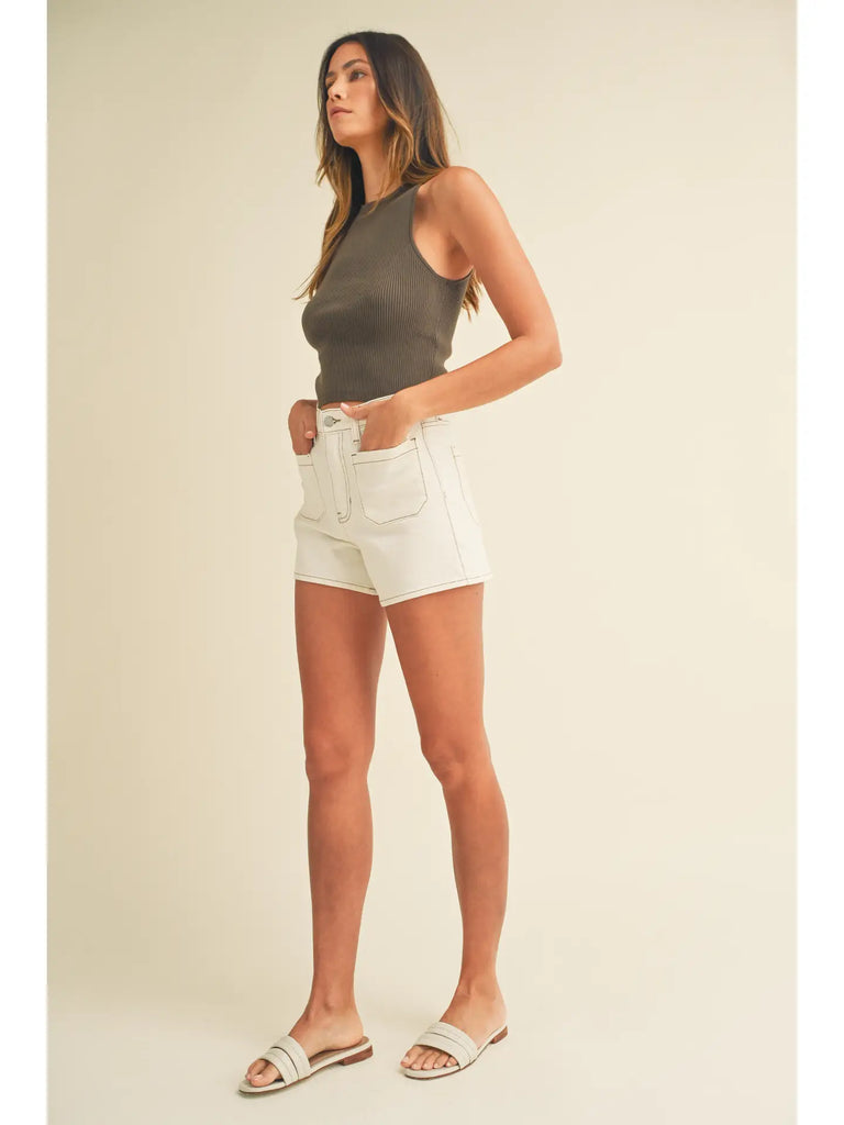 Get ready to hit the beach in style with our Sandy Point shorts! These cute off-white shorts are the perfect addition to your early summer wardrobe. With a 12" rise and 3.5" inseam, these patch pocket shorts provide both comfort and style. Made from a blend of cotton, elasterel-P, and spandex, these shorts will keep you feeling cool and comfortable all day long. Don't miss out on this must-have for your beach trips!