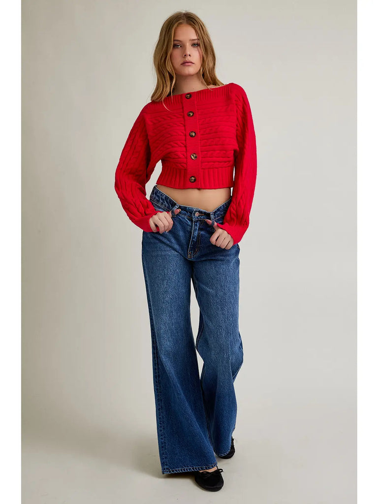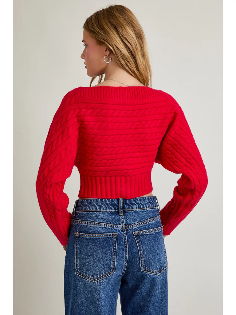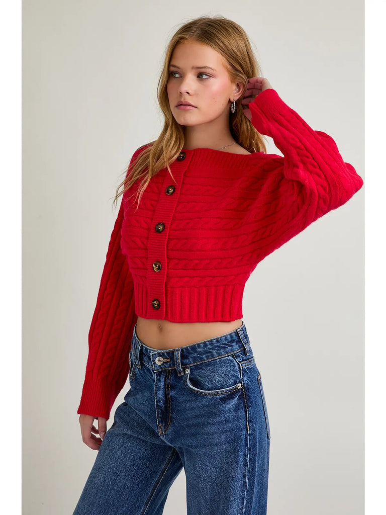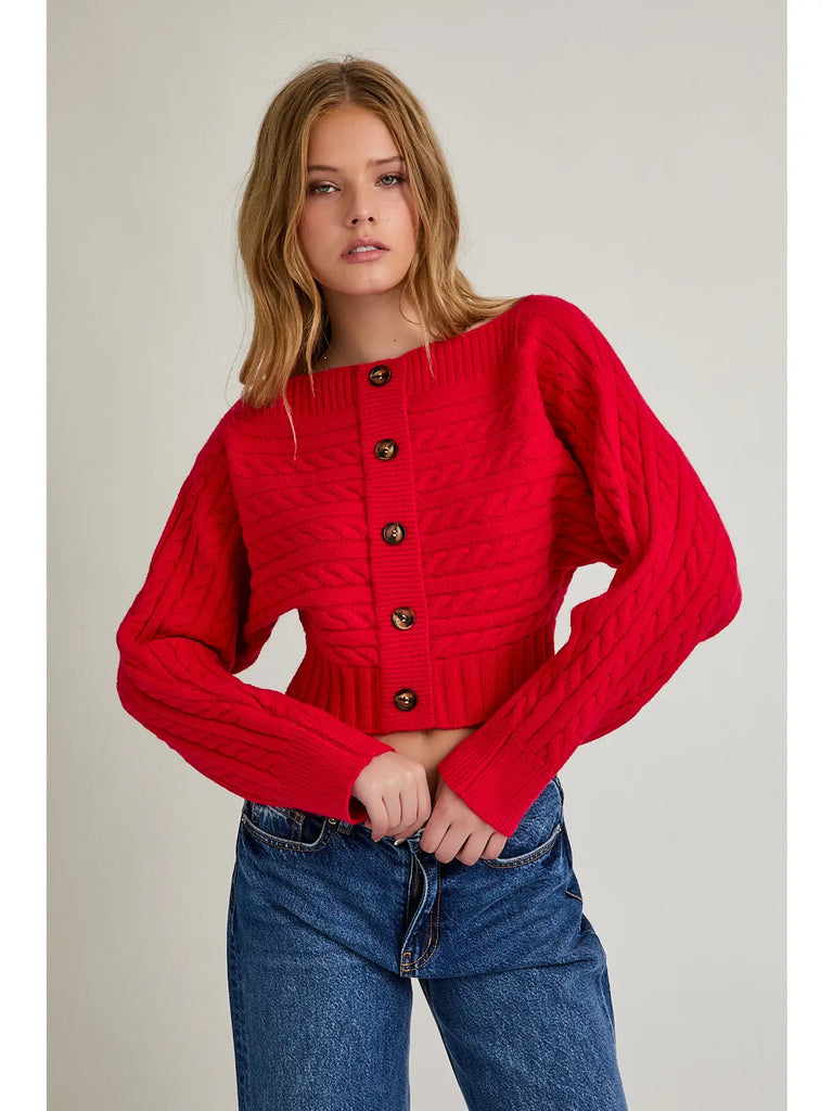 Wrap yourself in holiday cheer with this playful off-the-shoulder sweater! Featuring a chunky cable knit design in rich red, it's the perfect cozy layer for festive gatherings. The charming button detail adds a touch of whimsy, while the relaxed silhouette keeps you comfortable all season long. Pair it with leather pants for an effortlessly chic look that captures the spirit of the holidays. Your new go-to piece for spreading seasonal joy!